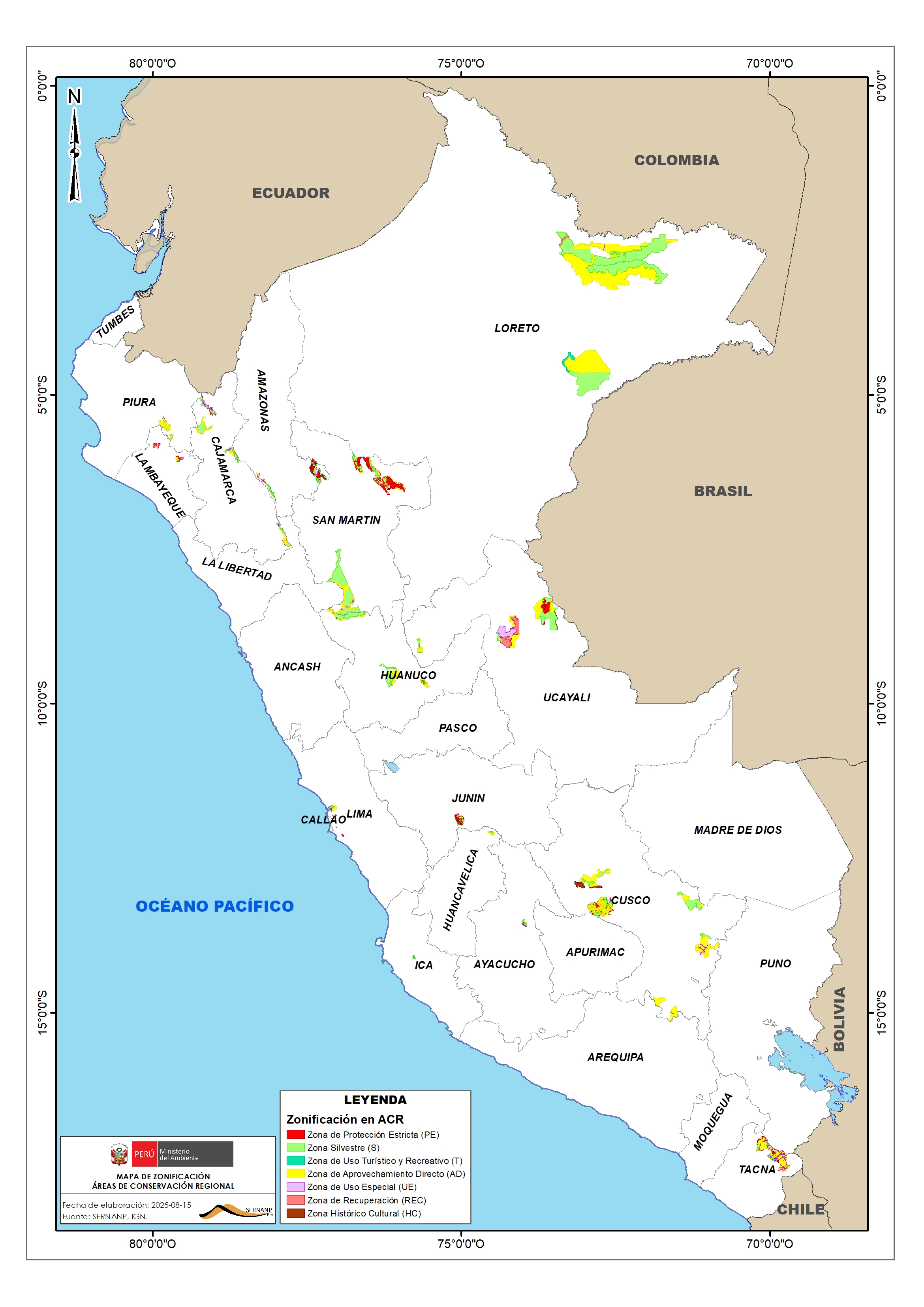 Representa las diferentes zonas al interior de Área de Conservación regional, aplica los mismos tipos de clasificación interna de zonas de las áreas naturales protegidas de administración nacional: - Zona de protección estricta (PE) - Zona silvestre (S) - Zona de uso turístico y recreativo (T) - Zona de aprovechamiento directo (AD) - Zona de uso especial (UE) - Zona de recuperación (REC) - Zona histórico cultural (HC)