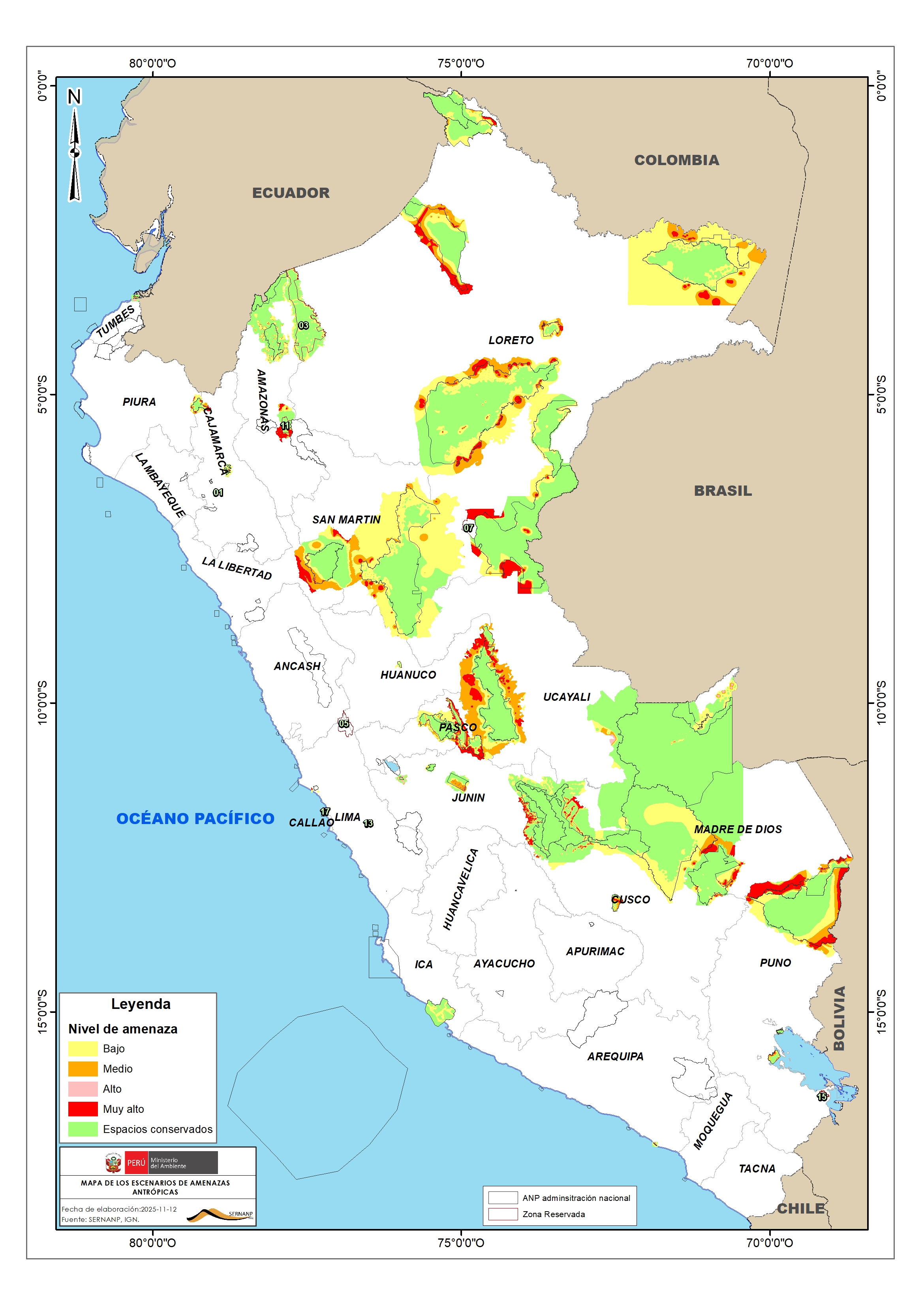 Representa los niveles de amenazas como resultado de un ejercicio de priorización de las mismas, dentro de las ANP y sus zonas de interés. Considerando los niveles: Nivel de amenaza bajo, Nivel de amenaza medio, Nivel de amenaza alto y Nivel de amenaza muy alto.